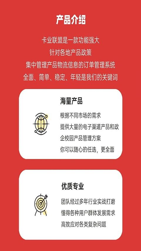 作为代理商,使用这款app不仅能够快速获取市场资源,还能通过灵活的佣金政策和多种功能提升业务效率,非常适合有志于号卡分销的朋友。如果你正在寻找一个可靠且高效的流量卡管理平台,卡业联盟app绝对值得一试!