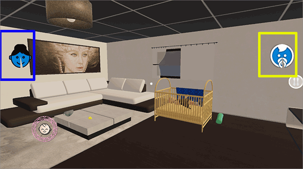 1、进入游戏后,可以看到我们在一房屋内,蓝色方框内是宝妈的状态,受饥饿值影响,需要补充食物维持健康,黄色方框内是宝宝的状态,需要宝妈完成宝宝的想法来实现正常;