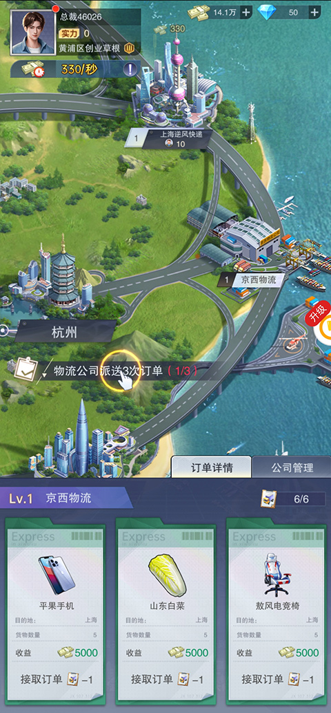 5、员工招募好了一切都准备就绪了就是开始我们的工作环节了,派送三次订单,选择贵一点的订单,这样我们才能赚取更多的钱;