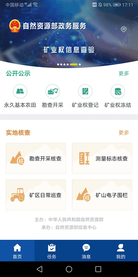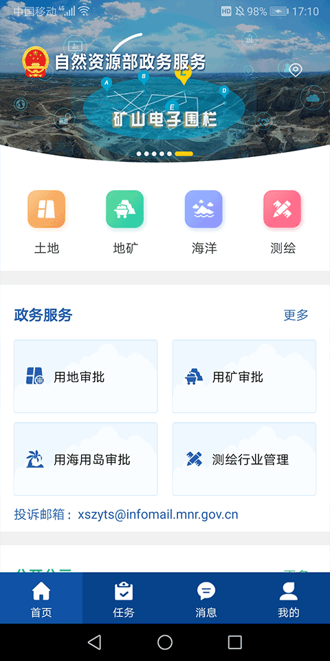提供矿产、土地、测绘等领域的信息公开公示,以及用地审批项目公示信息查询和服务指南浏览,方便用户随时随地掌握相关信息。