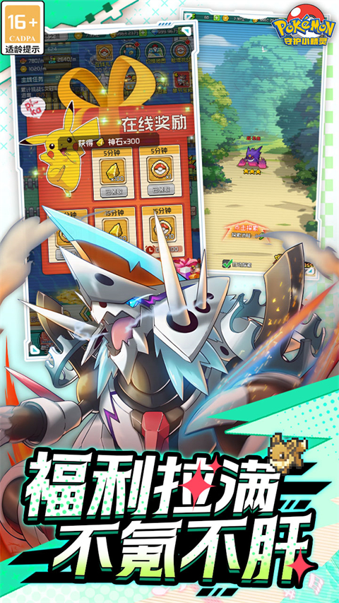 除此之外,在守护小精灵更是还原了原著中的诸多宝可梦,无论是御三家的小火龙、杰尼龟和妙蛙种子,还是准神的快龙、烈咬陆鲨,以及神兽的裂空座、超梦等角色都进行完美复刻,并且玩家还能通过游戏内免费的福利来进行获取,有兴趣的小伙伴可以下载游戏来进一步体验。