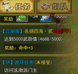 武勋任务:武勋任务有一定的难度,完成驰名天下需要20000的武勋,可通过门派战,正邪之战来获取武勋,但这还远远不够