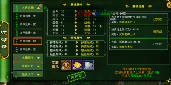 江湖录的玩法奖励主要分为4大类:基础属性加成、特殊属性加成、道具材料奖励、额外功能解锁
