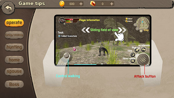 1、进入游戏,我们滑动屏幕可以看视野,左手变按钮控制走动,左上角是恐龙的状态,右上角是地图以及所在位置,右手边大按钮为攻击,其他分别控制头槌、咆哮、叼起、加速;