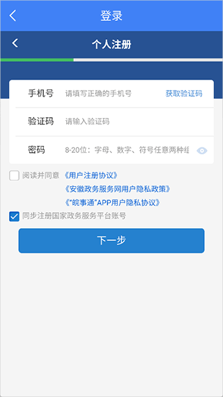 2、然后输入手机号后点击【获取验证码】,收到验证码后填写,然后对密码进行设置后点击【下一步】