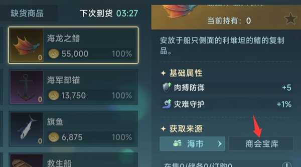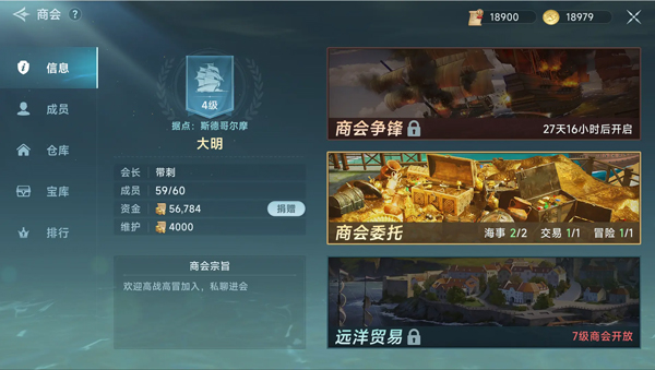 4、一段时间未换取则其他会员也可以换取;交易任务则是投资类任务,完成后直接奖励玩家商会商业宝箱;冒险任务同样强度较高,需要会员组队完成,与海事任务不同,冒险任务可以获得的道具是根据玩家在任务中的操作决定的,玩家进入陆地后击败NPC或是开启宝箱都会获得道具,这些道具不会直接给玩家,而是进入商会宝库,也就是说在陆地内击杀NPC开宝箱越多能换的道具也就越多,换取方式与海事相同。如果遇到海事或者冒险任务打不过的情况,也可以请商会大佬们帮忙带一带任务,因为商会任务是不耗费体力值的,并且即使本周任务已完成也可以跟随没完成的会员再次接取,部分商会会规定商会任务直通车的时间,会员们也可以留意。