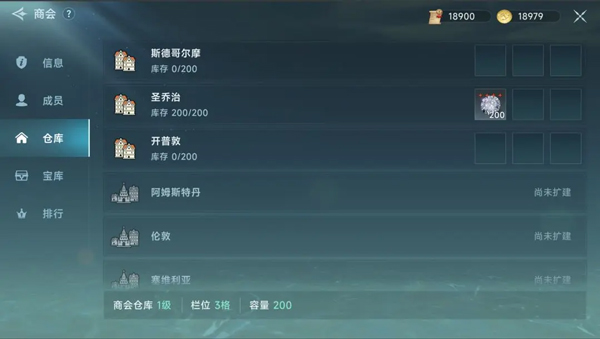 6、接下来讲商会仓库,商会仓库是为会员提供囤货的地方,虽然叫商会仓库但是并不是会员共享,而是每个会员单独的仓库,根据商会等级仓库的数量以及容量可以升级增加,直至商会升到最高等级,所有地点均可开启仓库。