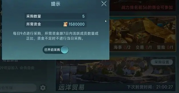 8、开启状态下每日9:00时到货并且消耗一次商会资金,消耗资金数量浮动与商会活跃人数有关,由于连续开启商会资金会极速下降,在商会未升级完毕的状态下请务必谨慎,同时避免资金消耗完卡维护费导致商会解散。
