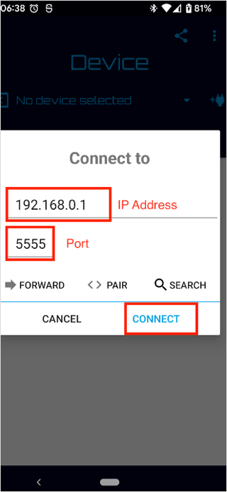-搜索并连接到网络上将 adbd 配置为侦听端口 5555 的 Android 设备