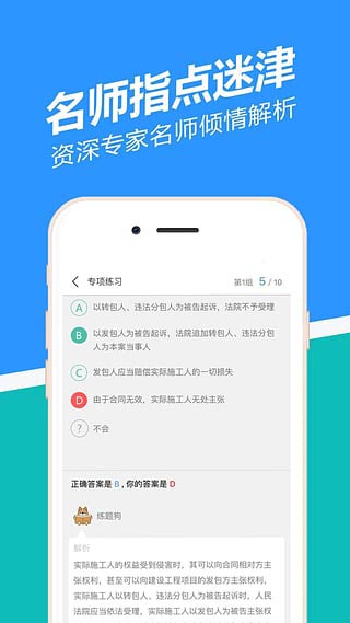 建造师练题狗是二建考生专用的实现科目练习和模拟考试的手机端APP软件,原名二建练题狗app,也是五星级评价的职考宝典和备考顾问,拥有智能的评估辅导,完美的错题巩固机制,精选的历年全真考题,以及资深专家名师倾情解析,可以让考生更好的复习,从而轻松通过考试,欢迎免费下载体验。目前软件集智能辅导、名师解析、全真题库和精准考讯于一身,其主要功能是在移动设备上实现科目练习和模拟考试,是考生必备的提分过关神器。
