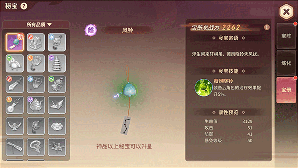 秘宝不仅能为各位大侠带来属性上的加成,佩戴起来也让角色的外观造型更加充满个性!各位大侠不妨多多收集解锁,凡是获取过的秘宝,都会在宝册界面显示,方便各位大侠在培养时甄别选择。