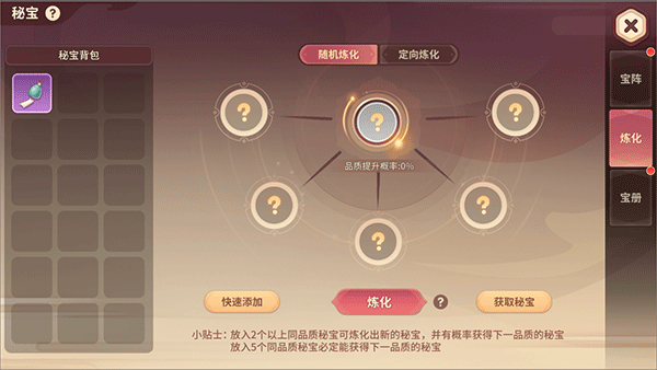 各位大侠可以通过日常活动收集各类秘宝用于炼化,只需放入2个以上同品质的秘宝,即可炼化出新的秘宝,放入的同品秘宝越多,提升秘宝品质的概率越高,如果放入5个同品的秘宝,必然可以炼化出一个新的高级秘宝。