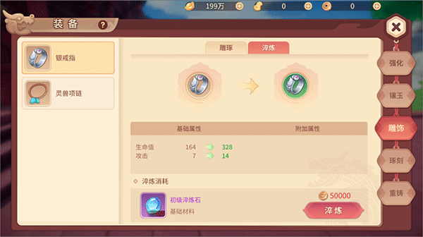 装备中只有戒指和项链可以进行雕饰,雕饰分为雕琢和淬炼两种。雕琢可以提升戒指和项链的雕琢等级,提升戒指和项链的固有属性;而淬炼则会提升戒指和项链的品质等级,并有一定概率获得附加属性。