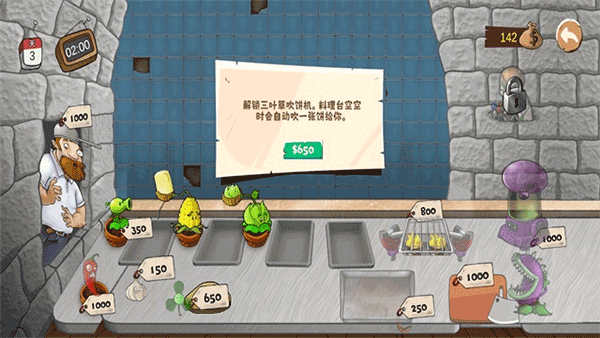 1、早期先买双发和大嘴花,然后就是买三叶草和戴夫,之后买大蒜,再之后就升机枪和戴夫,再再之后烤阳光菇和辣椒酱二选一,接着买烤盘,最后一定要攒够3000再买饮料机