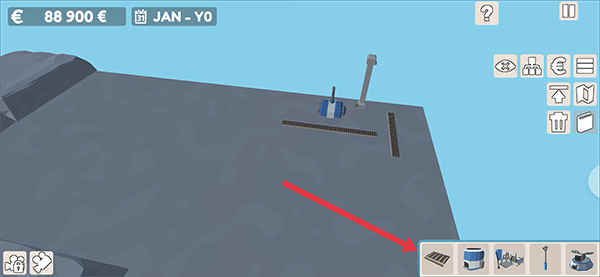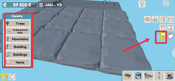 2、每一种矿石和液体都覆盖着石头,如何你想开始采矿你需要移除石头,而要移除石头或树木,请点击垃圾桶按钮,然后在删除选择器中,点击相应的物体即可删除它