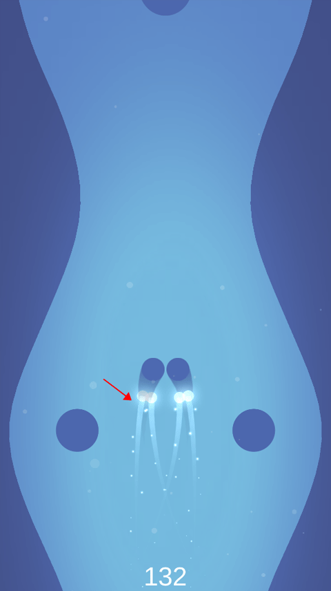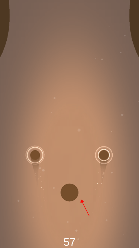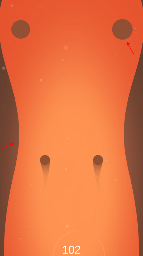 3、游戏的玩法就是两种:长按屏幕、松开屏幕,当遇到道路非常窄,两边都有障碍物的情况下,就需要长按屏幕,让两个圆点交叉在一起,使圆点不受到伤害;而遇到两个圆点中间出现障碍物时,就需要松开屏幕,让两个圆点分散开来。