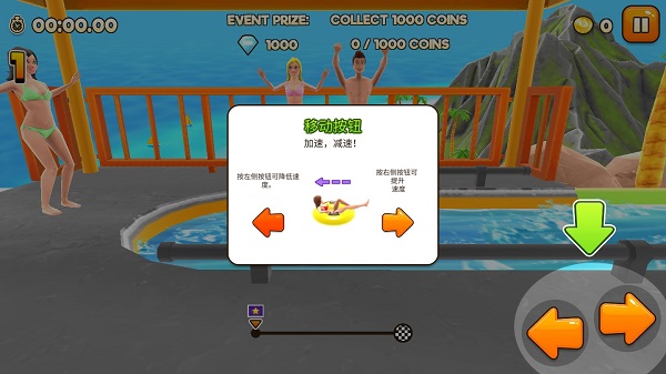 游戏中主要以水上乐园中的管道为路径,通过吃到游戏中的金币和造成破坏来获得金币,游戏中会有隐藏的钻石,一般是在高空或者水底。游戏中需要注意通过加速后容易“起飞”,而且游戏中的物理引擎比较“反牛顿”,所以在空中保持好平衡或者翻转之后保证不用脸去刹车是保命的关键。主要通过左下角的翻转来控制空中的行动,右下角的前后代表加速和减速,在空中时也有一定的控制效果,但是并不强烈。游戏中也有计时功能,通过右上角来查看时间,通关时间越快越容易进入排行榜。