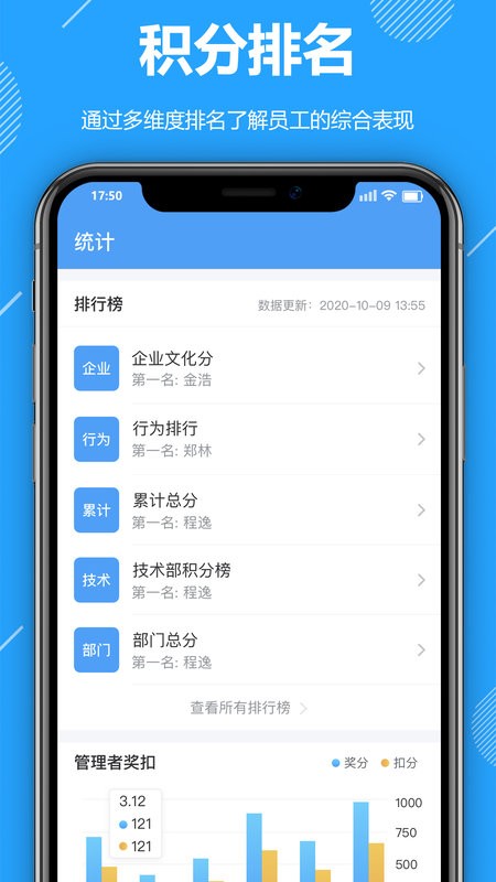 自定义查看公司、部门的积分数据情况,个人数据阶段性分析,详细了解员工工作状态的变化,基于数据分配,为员工搭建公平公正的平台。