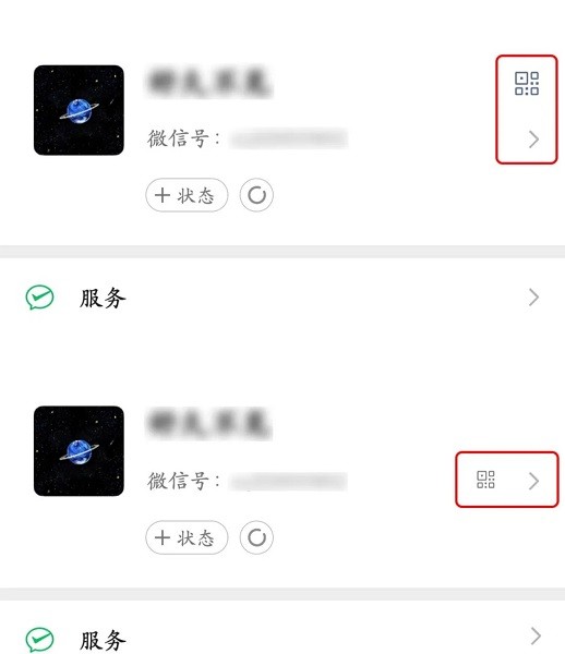 在微信的「我」主页,这里一个明显的变化是二维码位置,包括二维码图标和小三角图标的位置都有变化,由以往的横向变为了竖向排版,对比就像下图这样。