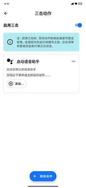 tap,tap双击背部是利用 Android 11 代码以识别双击设备背部手势的一个应用,支持Android 7.0+的设备。您可以借助手势来启动应用、控制设备(包括触发 HOME 键,返回键,最近任务键等)、截图、开关手电筒、启动语音助手等等。利用「门槛」,您可以阻止手势在屏幕关闭时、通话时、或者某个应用启动时等情况下工作。它使用无障碍服务来执行这些动作,并保持在后台运行。