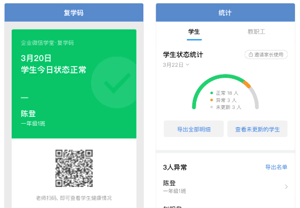 使用复学码,每天定时提醒家长和教职工填写学生健康信息,帮助学校统一管理出入校园。