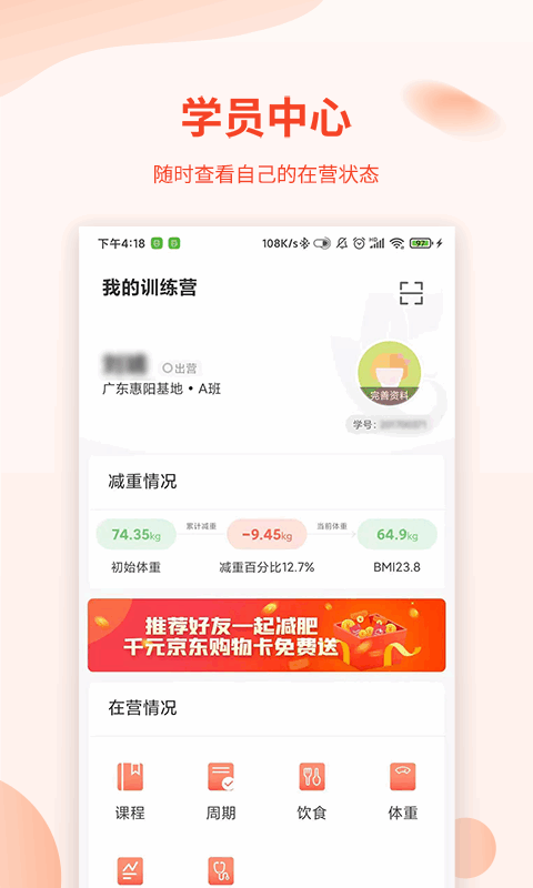 APP里还有学员中心,可以查到自己的状态,家长也能了解孩子在营里的状况,这点设计得很贴心。应用亮点包括全面的肥胖检查、半军事化管理训练、个性化膳食方案等,特别是感恩励志课程和高效的减脂课程,感觉不仅能减肥还能培养孩子的意志力和自信心。