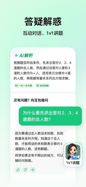 我们提供深入的互动对话平台,支持1v1的个性化讲题服务,确保每位学生的疑问都能得到详尽解答,让学习之路畅通无阻。