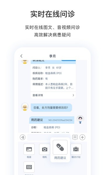 实时在线图文、音视频问诊,高效解决病患疑问。