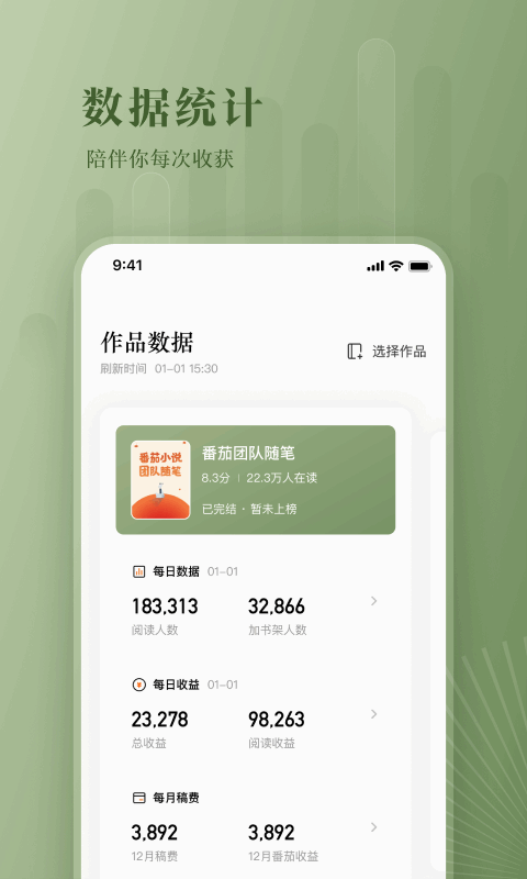 -- 数据查看功能,包括作品每日数据、每日收益、每月稿费等数据查看。