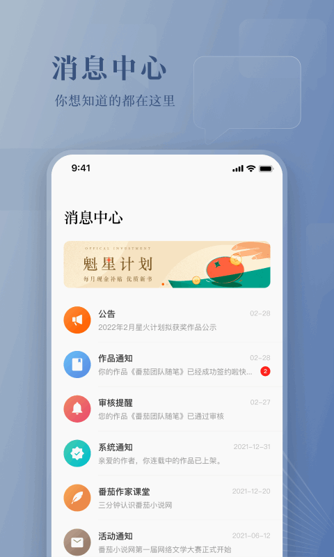 -- 消息通知和公告,能够查看平台发布的公告,接收到平台信息,及时了解作品状态和平台相关动态。
