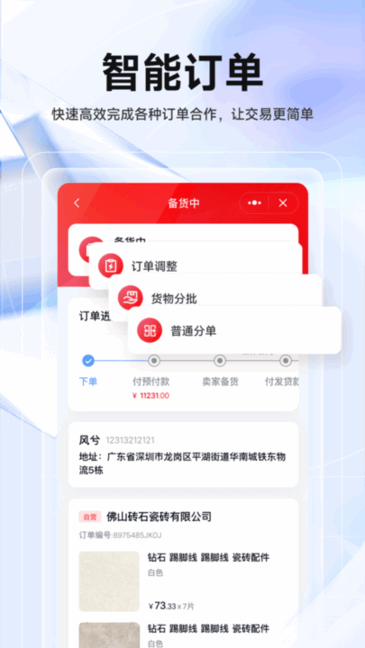 -- 订单全流程自动化、智能化。支持自动接单,自动拆单下单,同时支持分批发货及每个批次单独付款、收款;