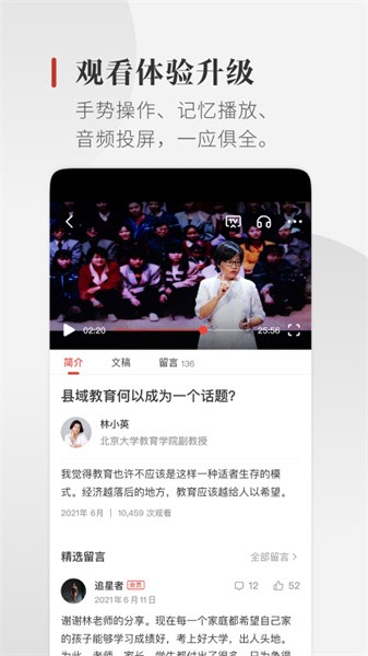 你可以在观看视频和收听音频之间自由切换,并有专辑连播和定时关闭功能,更适合睡前聆听。阅读文稿、记忆播放、1080p超清投屏、赠送好友......还有更多功能等待你的发现。
