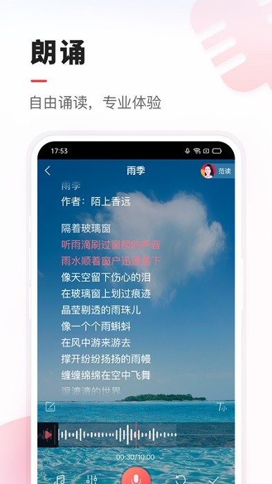 朗诵:不仅有大量美文、诗歌、名家名篇等文本素材,也可以根据自己喜好自主导入想读的文本,让可诵读范围更广泛,强大的声音处理技术,给你专业播音员的朗读体验。
