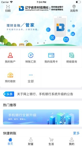 辽宁省农村信用社手机银行随时随地自助办理业务,免除您排队的烦恼; 提供账户查询、账户管理、转账汇款、转账查询、充值缴费、个人设置等功能的移动金融服务。