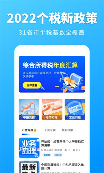 App里还有专门的年终奖计算器,根据2022年的新政策来算,挺贴心的。除此之外,它还提供了很多个税相关的资讯和常见问题解答,比如专项扣除、申报流程这些,都是大家比较关心的内容。特别是对于不太懂税务的人来说,这个功能真的很实用。