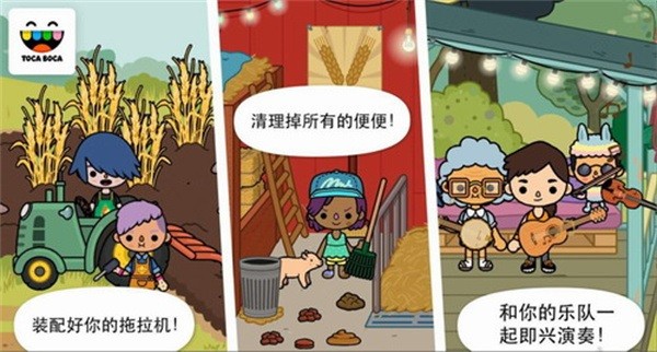 模仿农民工作嬉戏!可以给奶牛挤奶、去鸡窝收鸡蛋,还能种植庄稼。拉拉小堤琴,躺到干草堆里睡上一觉!从日出到日落,Toca生活:农场为您带来只属于农场的快乐!