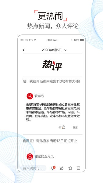 “头条”、“天下”、“深度”频道主打突发事件等重大新闻,让新闻更快速。半岛都市报作为一张已陪你16年的报纸,懂你的人是我是我还是我,在“青岛”、“财经”、“楼市”频道,我们关心青岛的大事小事身边事,无数的半岛小伙伴为你跑腿,跟你谈政策,陪你聊八卦。