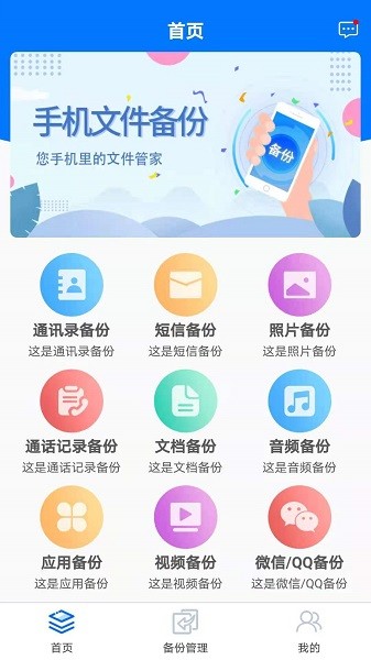 手机备份手机软件是一款能够帮助用户们快速备份手机数据的app,用户们能够将自己手机中的各种数据文件备份之后传输到云端,防止手机数据丢失。通讯录、短信、照片、通话记录、文档、音频、应用、视频、微信qq等等等等全都能够便捷备份,帮助用户们保存重要数据,还有好的隐私保密功能,让用户们可以放心使用。