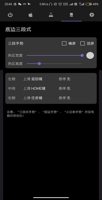 简易手势:在屏幕左右和底部添加向屏幕内侧滑动的手势热区,拥有滑动或者滑动悬停两种操作方式组合。这是最经典易用也是Gesture默认的操作方式。