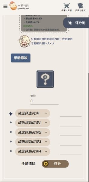 原神圣遗物评分计算器官方版是专为原神玩家打造的圣遗物评分工具,通过软件可以为你的圣遗物进行评分,只要输入圣遗物的数据就可以知道你的圣遗物可以打多少分了。