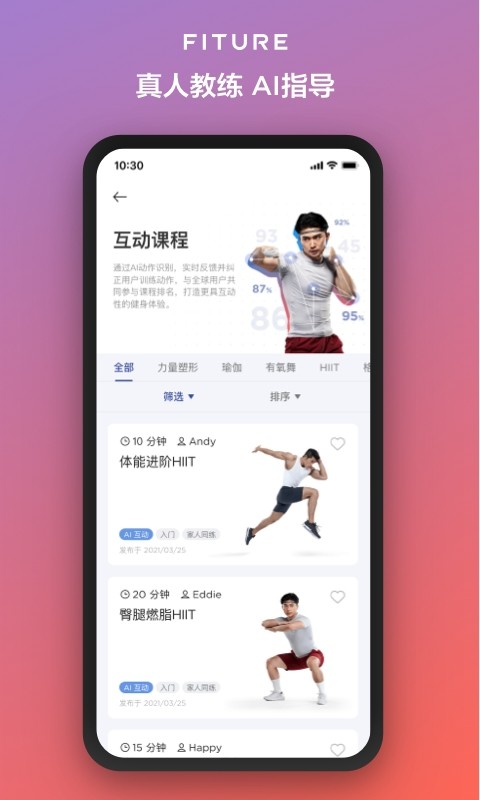 fiture官方版是一款提供健身运动服务的应用软件,带来丰富的课程内容,专业的教练指导,一对一专属服务,定制个性化运动方案,带来专业化健身和督促陪伴,训练数据实时记录,智能分析,科学评测,非常实用,让健身不再枯燥无味!
