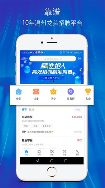这款温州招聘网APP看起来挺实用的,毕竟是十年的老品牌了,本地影响力很大,月均访问量500万,用户量也有70万,说明大家用得挺多。APP里把岗位分得很详细,有兼职、蓝领这些分类专区,还支持在线和HR沟通,感觉找工作方便不少。