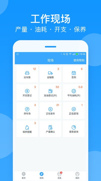 拥有丰富的现场状态图标内容,该页面汇总设置了停车场保养提醒平均油耗以及加油登记等不同数量图标。