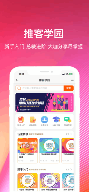 苏宁易购退推客app是苏宁易购旗下提供推广服务的应用app,优选海量好货,品类丰富多样,自由搜索选择,更多优质资源推荐,高佣榜单实时推送,新手入门、总裁进阶、大咖分享尽在掌握,轻松学习,绝对是你提升收入的必备软件!