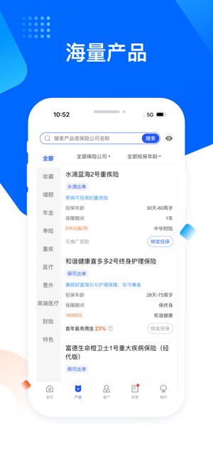 我们拥有海量保险产品资源,涵盖年金、寿险、重疾、医疗、意外、财险等多个领域,满足客户多样化的保险需求。