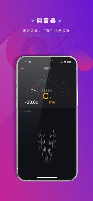 7、调音表功能,适用于吉他、尤克里里、贝斯、有标准降半调等21种特殊调弦方案