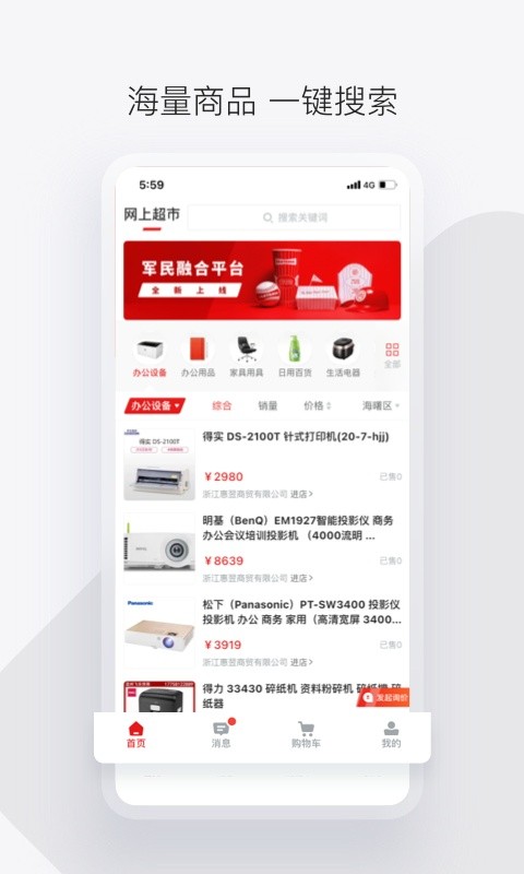 政采云军采,专为用户打造的办公用品采购软件,在这里用户可以轻松采购到自己需要的办公类用品资源十分方便,平台包含的产品门类十分丰富,大量优惠活动等待玩家参加,十分方便,有需要的用户可以下载使用!