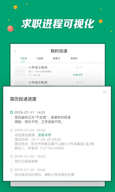 投递后单位对简历的处理情况,实时更新,一目了然,面试or拒绝都能第一时间得到反馈