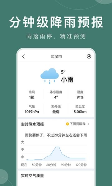 准时天气预报几点几分下雨为用户提供长达40天的天气预报,通过软件随时都可以获得更早的天气信息,还有分钟级的降雨预报也可以随时获得提醒,让用户出行不用担心淋雨。