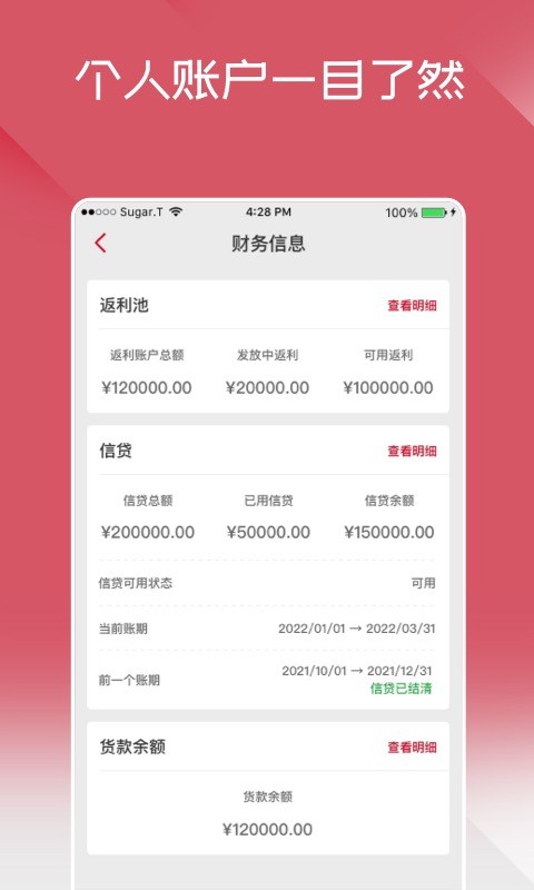 经销商可以通过“财务信息”入口集中查询自己的返利、信贷、货款余额的当前额度及历史明细,第一时间确认自己的各类款项进出情况;